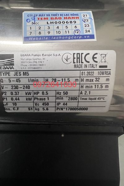 Tốc độ vòng quay động cơ: 2900 vòng/phút