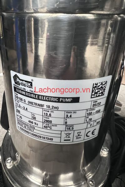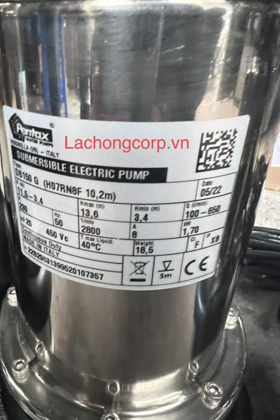 Máy bơm chìm nước thải Penax DB150G. Máy bơm chìm nước thải Pentax series DB là 1 loại máy bơm kiểu mới. Đây là loại máy bơm thoát nước với bánh công tác “Kênh đôi” để bơm nước tích điện và chất lỏng có chất rắn lơ lửng. Là dòng máy bơm lý tưởng cho các ứng dụng dân dụng và hộ gia đình. Sản phẩm có công suất làm việc là 2,26 HP. Được sử dụng chủ yếu trong các công trình, hệ thống xử lý chất thải quy mô nhỏ, dân dụng.
