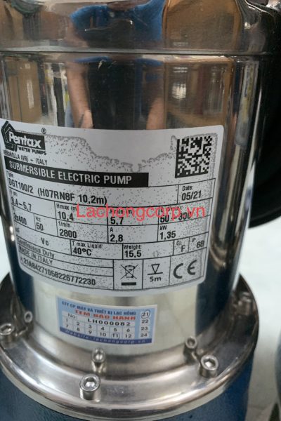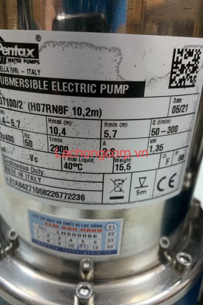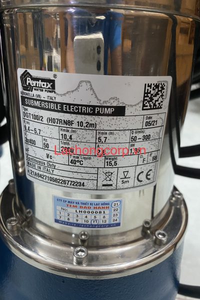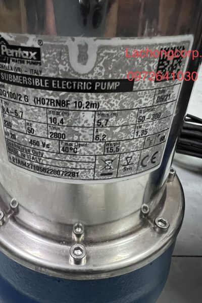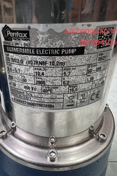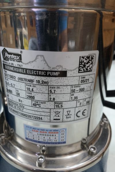 Máy bơm chìm nước thải Pentax DG 100/2G. Máy bơm chìm nước thải Pentax DG công suất nhỏ 1.8 HP. Được sử dụng bơm hút, xử lý các loại chất thải, nước thải có chất rắn lơ lửng trong dân dụng, gia đình,…