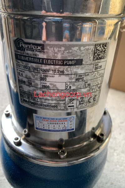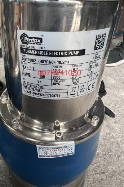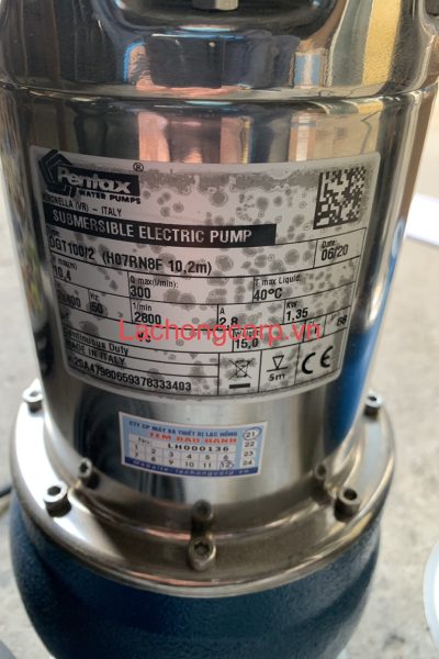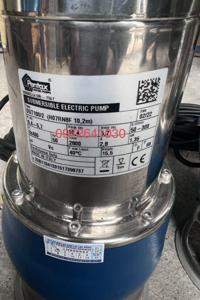 Máy bơm chìm nước thải Pentax DGT100/2. Máy bơm chìm nước thải Pentax DG công suất nhỏ 1.8 HP. Được sử dụng bơm hút, xử lý các loại chất thải, nước thải có chất rắn lơ lửng trong dân dụng, gia đình,…