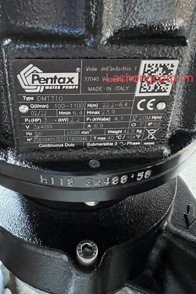 Máy bơm chìm nước thải Pentax DMT310. Máy bơm chìm nước thải Pentax series DMT là 1 loại máy bơm nước thải được thiết kế kiểu mới, hiện đại. Với thiết kế đặc biệt, được làm bằng gang chắc chắn có độ bền và khả năng chịu tác động cao. Sản phẩm có công suất làm việc là 2.2KW. Sử dụng điện áp công nghiệp 3 pha với hiệu điện năng 380V. Nên máy bơm nước này sẽ được sử dụng phổ biến trong hệ thống xử lý chất thải công nghiệp.
