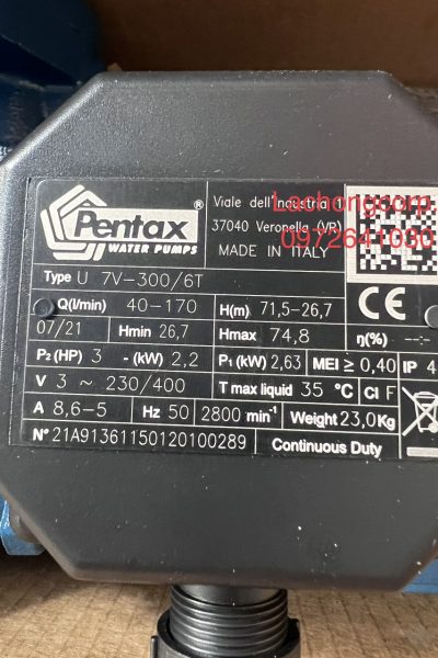 - Máy bơm Pentax U7SV-300/6T đạt chứng nhận CE – đảm bảo tuân thủ các tiêu chuẩn kỹ thuật, an toàn điện và giới hạn phát xạ theo quy định của Liên minh Châu Âu.