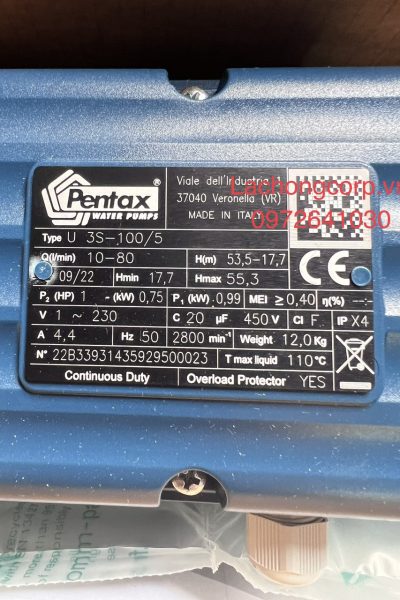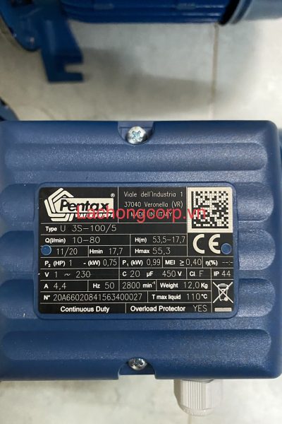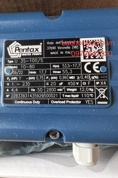 Máy bơm tăng áp trục ngang Pentax U3S-100/5. Máy bơm nước tăng áp trục ngang gia đình Pentax series U3S-100/5 là dòng sản phẩm bơm nước công suất nhỏ. Máy bơm có khả năng làm việc là 0.75kw tương ứng với 1hp. Sản phẩm chạy điện dân dụng dùng phổ biến trong các hộ gia đình là 1 pha 220V. Máy bơm nước Pentax U3S-100/5 có khả năng bơm hút được 10 ÷ 80 lit/phút. Cùng với đó là cột áp của sản phẩm dao động trong khoảng 53.5 ÷ 17.7 mét. Tương ứng với Q = 10 lít/phút thì H = 17.7 mét và ngược lại.